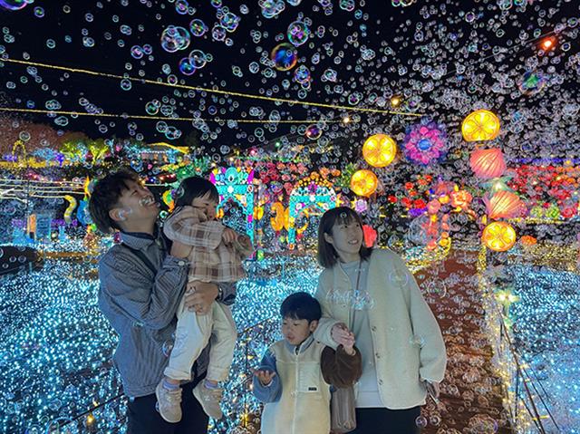 無数のシャボン玉が会場を乱舞する「バブルファンタジーショー」=14日、静岡県伊東市の伊豆ぐらんぱる公園