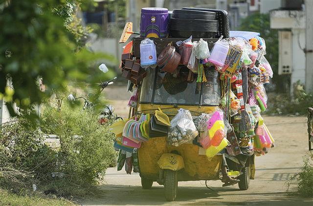 インド・ハイデラバードで、家庭用プラスチック製品を満載して走る小型車。品ぞろえに自信あり?(AP=共...