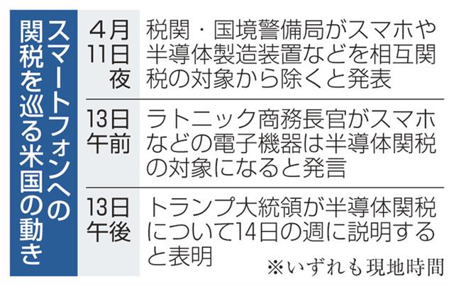 【ワシントン共同=小田島勝浩】トランプ米政権は13日、「相互関税」から除外したスマートフォンなどの...