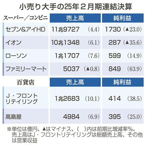 小売り大手6社の2025年2月期連結決算が17日、出そろった。セブン&アイ・ホールディングスとイオ...