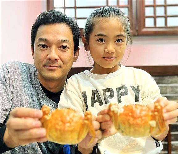 娘と上海ガニを楽しむ関口さん(左)