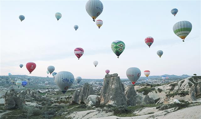 トルコ中部の観光地カッパドキアに浮かぶ熱気球。奇岩を見ようと世界中から観光客が訪れます。(ゲッティ=...