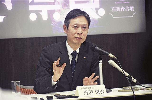 決算や自己株取得などについて発表したJR東海の丹羽社長(30日、名古屋証券取引所で)