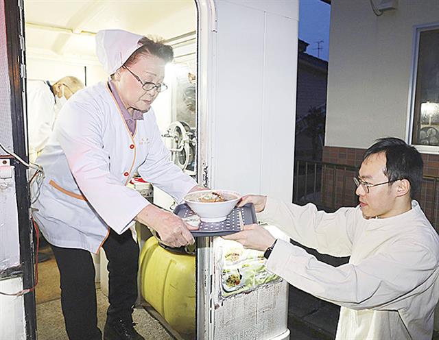 常連客(右)に出来たてのラーメンを渡す丸山寿子さん=北海道北斗市