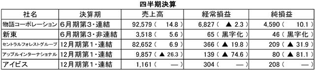 四半期決算 物語コーポレーション 新東 セントラルフォレストグループ アップルインターナショナル アイビス