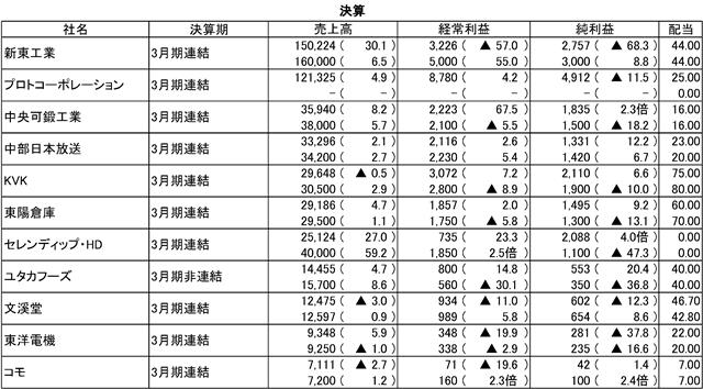 決算詳報 前3月期 新東工業 プロトコーポレーション 中央可鍛工業 中部日本放送 東陽倉庫 セレンディップHD KVK ユタカフーズ 文溪堂 東洋電機 コモ