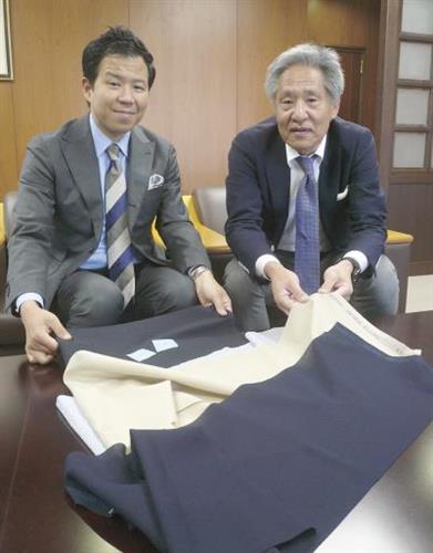 ファンシーテックスの生地に手を添える渡邉社長(右)と鷹岡社長