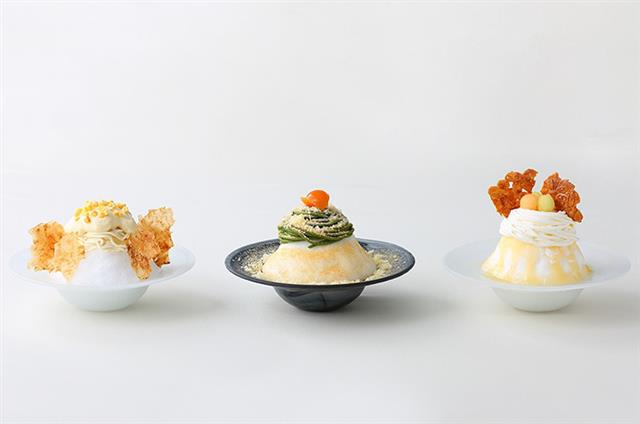天空のモンブランかき氷(左からとうもろこし・西尾抹茶・メロンレモン)