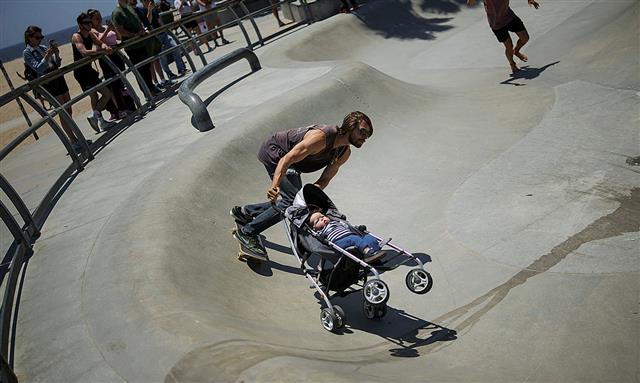 米ロサンゼルスで、赤ちゃんの人形を乗せたベビーカーを手にスケートボードをする人。難しさを感じさせませ...