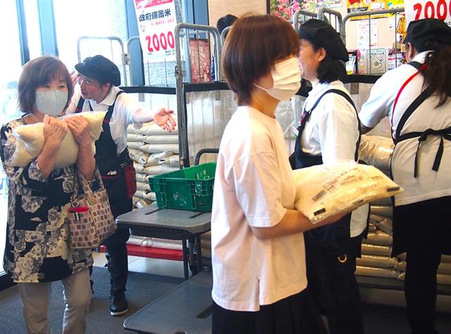 同社が仕入れた備蓄米は450トン。準備が整い、7日から多治見店、各務原中央店(各務原市)、光音寺店(名古屋市)、中小田井店(同)の4店で先行販売した。税込み価格は5キログラム2160円。各店とも550袋を用意し、整理券を配布して販売した。