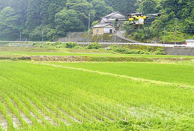水を張らない田んぼに肥料を散布するドローン=12日午前、新城市