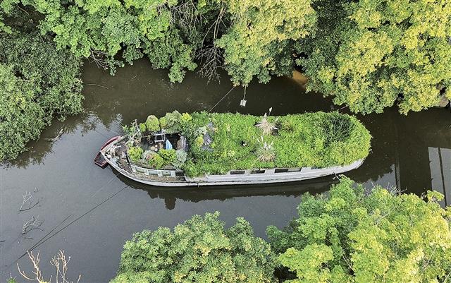 ドイツ・フランクフルトの川に浮かぶ草木が生えた船。自然の一部になったようです。(AP=共同)...