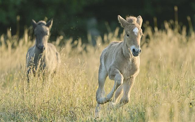 ドイツ・フランクフルト郊外の農場で、草原を軽快に駆ける子馬。生き生きとしています。(AP=共同)...
