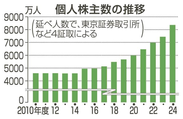 東京、名古屋、福岡、札幌の四つの証券取引所は4日、2024年度の個人株主が延べ人数で前年度比914...