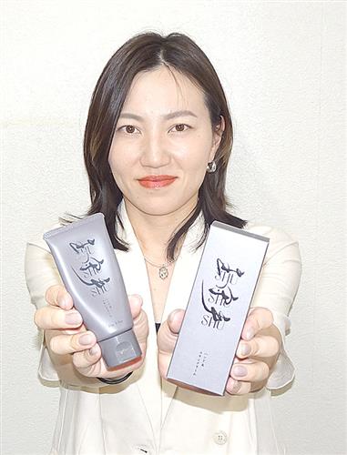 ハンドクリーム「主守手」を持つ開発者の杉山さん