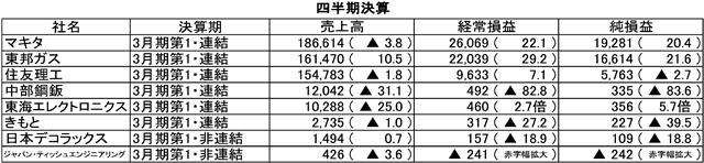 (注)単位は百万円、%。かっこ内は前年同四半期比増減率。▲は赤字かマイナス。IFRS適用企業(マキタ、住友理工)の「売上高」は「売上収益」、「経常損益」は「営業利益」、「純損益」は「親会社の所有者に帰属する当期利益」