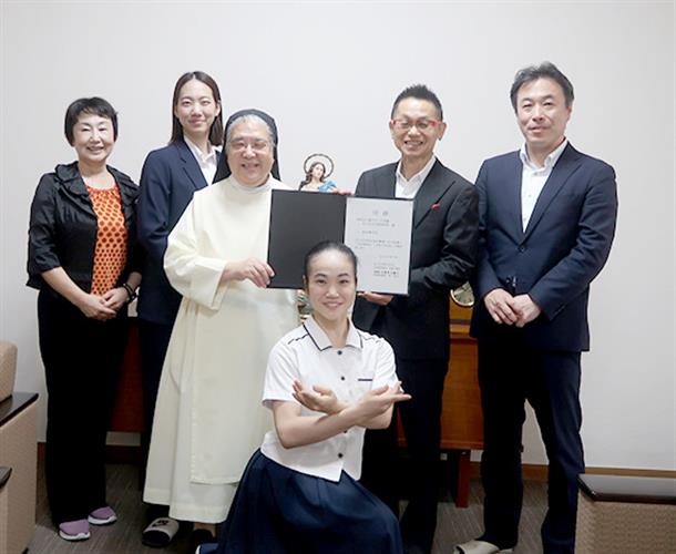 光ヶ丘女子高で行った贈呈式(右から2人目が佐野社長)
