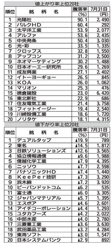 名証上場300社7月株価騰落率 8割が値上がり 上昇率1位は光陽社
