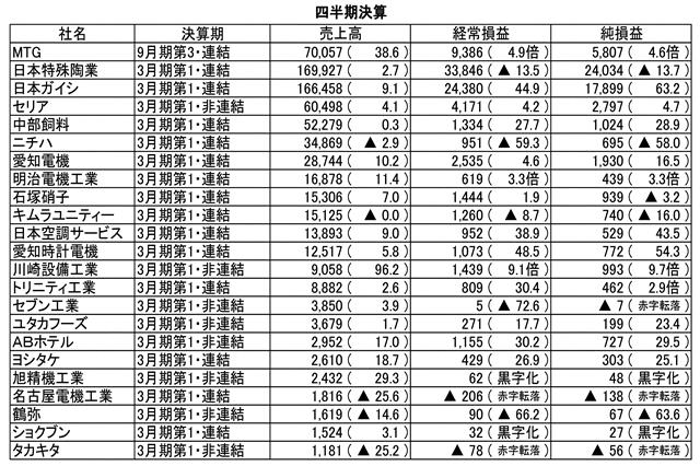 四半期決算 MTG 日本特殊陶業 日本ガイシ セリア 中部飼料 ニチハ 愛知電機 明治電機工業 石塚硝子 キムラユニティー 日本空調サービス 愛知時計電機 川崎設備工業 トリニティ工業 セブン工業 ユタカフーズ ABホテル ヨシタケ 旭精機工業 名古屋電機工業 鶴弥 ショクブン タカキタ