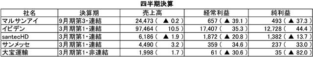 四半期決算 マルサンアイ イビデン santecHD サンメッセ 大宝運輸