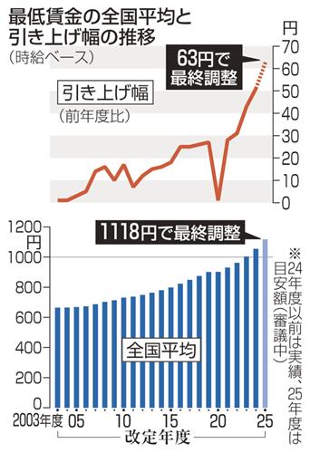 厚生労働相の諮問機関、中央最低賃金審議会は、最低賃金(時給)の2025年度改定の目安として、全国平...