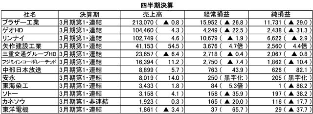 四半期決算 ブラザー工業 ゲオHD リンナイ 矢作建設工業 三重交通グループHD フジミインコーポレーテッド 中部日本放送 安永 東海染工 ソトー カネソウ 東洋電機