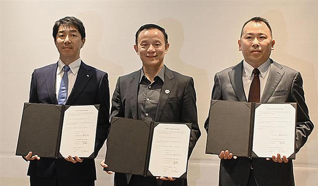 中国の電池大手CATLなどと蓄電池を供給する契約を締結し、写真に納まるダイヘンの服部将之執行役員(左)=6日午後、大阪市北区