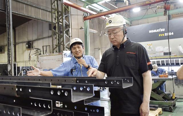 厚板に曲げ加工を施した製品を見る石黒市長(右)と戸松社長