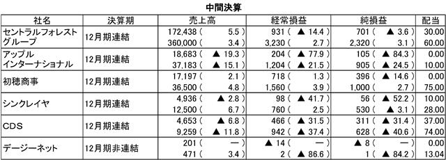 決算詳報 6月中間 セントラルフォレストグループ アップルインターナショナル 初穂商事 シンクレイヤ CDS デージーネット