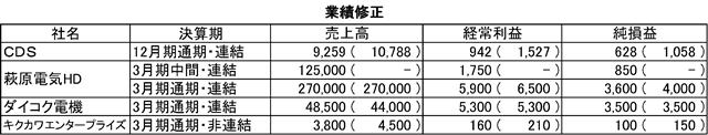 業績修正 CDS 萩原電気HD ダイコク電機 キクカワエンタープライズ