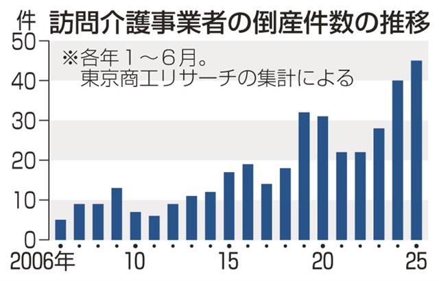 訪問介護事業者の倒産は2025年1~6月に全国で45件あり、2年連続で過去最多を更新したことが9日...