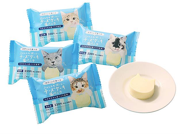 ネコのイラストで訴求する「にゃんともおいしいチーズケーキ 塩バニラ」