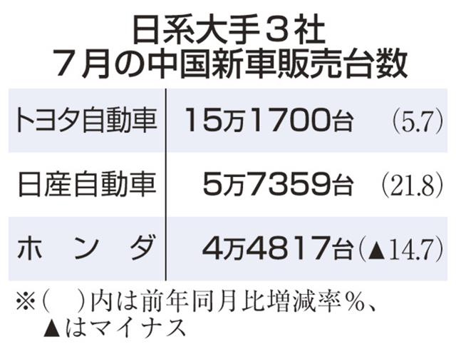 日産、中国7月販売21%増 トヨタはプラス、ホンダ減少
