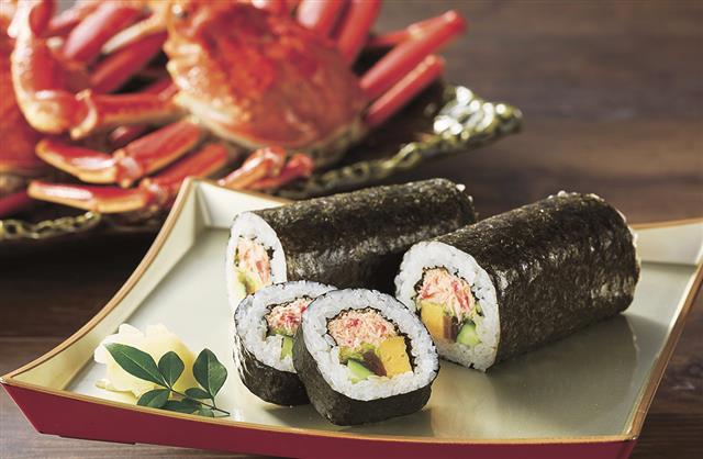 外食チェーンの甲羅(本社豊橋市)は、主力のかに料理専門店・甲羅本店で提供する「かに太巻寿司」=写真...