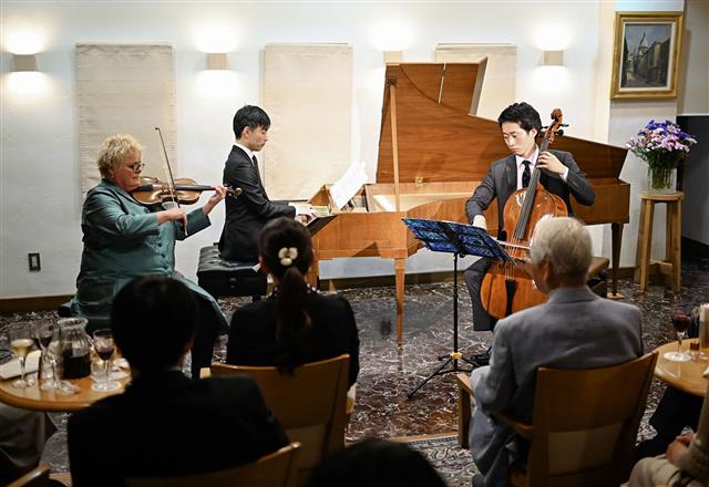 神戸市中央区のサロン「メランテ」で演奏する(左から)バイオリン奏者ウッラ・ブンディースさん、鍵盤奏者高田泰治さん、チェロ奏者鷲見敏さん=5月(日本テレマン協会提供)