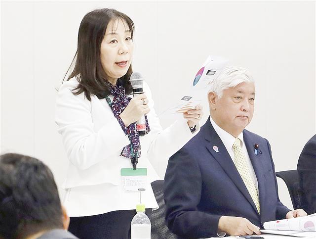 超党派の国会議員でつくる「依存症対策議連」の勉強会で発言する、公益社団法人「ギャンブル依存症問題を考える会」の田中紀子代表(左)=5月、国会