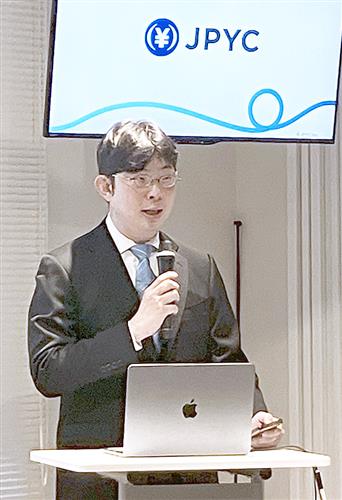 円建てのステーブルコイン発行について記者会見するJPYCの岡部典孝代表取締役=19日午後、東京都千代田区
