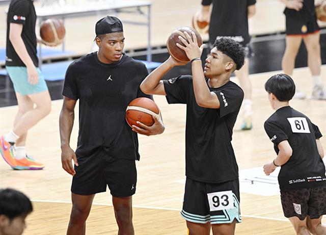 キャンプ参加者を指導するNBAレーカーズの八村(左)=IGアリーナ