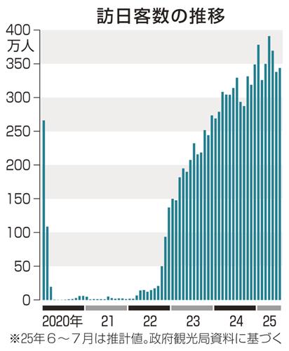 政府観光局は20日、7月に日本を訪れた外国人客は前年同月比4・4%増の推計343万7千人だったと発...