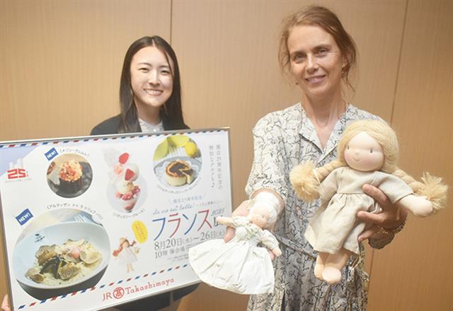 中部経済新聞社を来訪し、来場を呼び掛けるフランスの人形アーティストのペネロペさん(右)ら