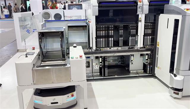 実装ロボットにAMRが部品補給用マガジンを搬送する様子