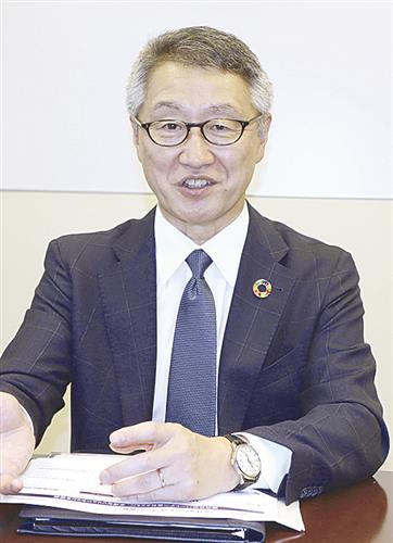 取材に応じるみずほインベスター・リレーションズの山崎栄一社長=7月、東京都千代田区
