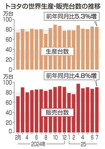 トヨタ自動車が28日発表した7月の世界生産台数は前年同月比5・3%増の84万6771台、販売は4・...