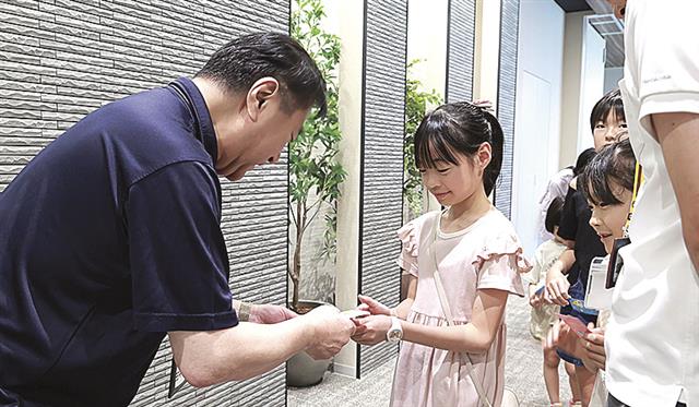 子どもと名刺交換する田中名誉会長