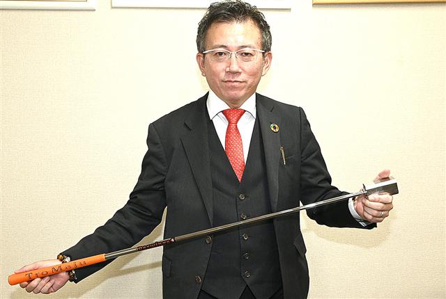ゴルフスイング矯正器具を手にする加藤社長