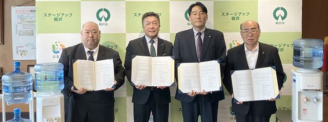 協定書を持つ加藤錠司郎稲沢市長(右端)ら