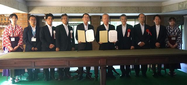 小村寿太郎記念館と明治村が交流協定を締結した(右から4人目が高崎氏)
