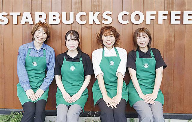 スターバックスコーヒーの店舗従業員で結成された「りんご隊」のメンバー=8月、青森県弘前市