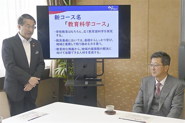 鳥取大の教員免許取得コースの名称変更について報告を受ける鳥取県の平井伸治知事(左)=5月、鳥取県庁