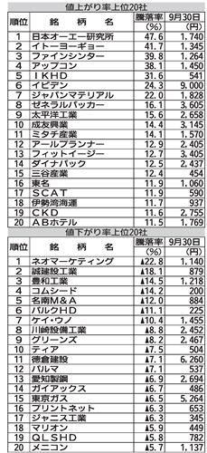名証上場306社9月株価騰落率 5割超が値上がり 1位は日本オーエー研究所
